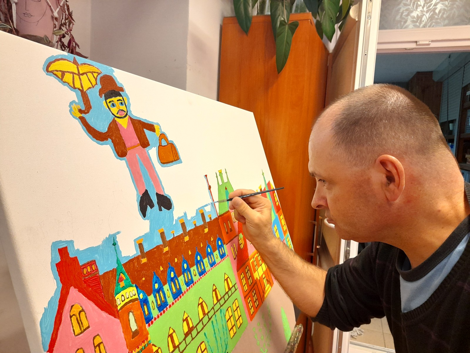 Jedną z jego wielu pasji jest malarstwo. Tworzy zarówno podczas zajęć w Centrum Terapeutyczno-Rehabilitacyjnym Ostoja w pracowni arteterapii, jak i w miejscu zamieszkania w Domu Pomocy Społecznej.
