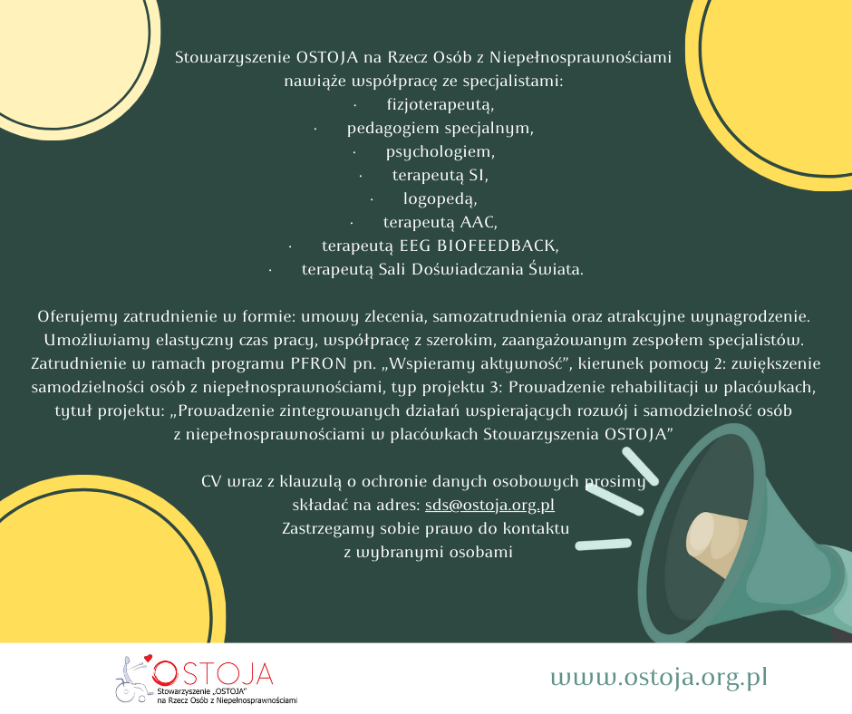 Stowarzyszenie OSTOJA na Rzecz Osób z Niepełnosprawnościami nawiąże współpracę ze specjalistami. Szczegóły na załączonym plakacie
